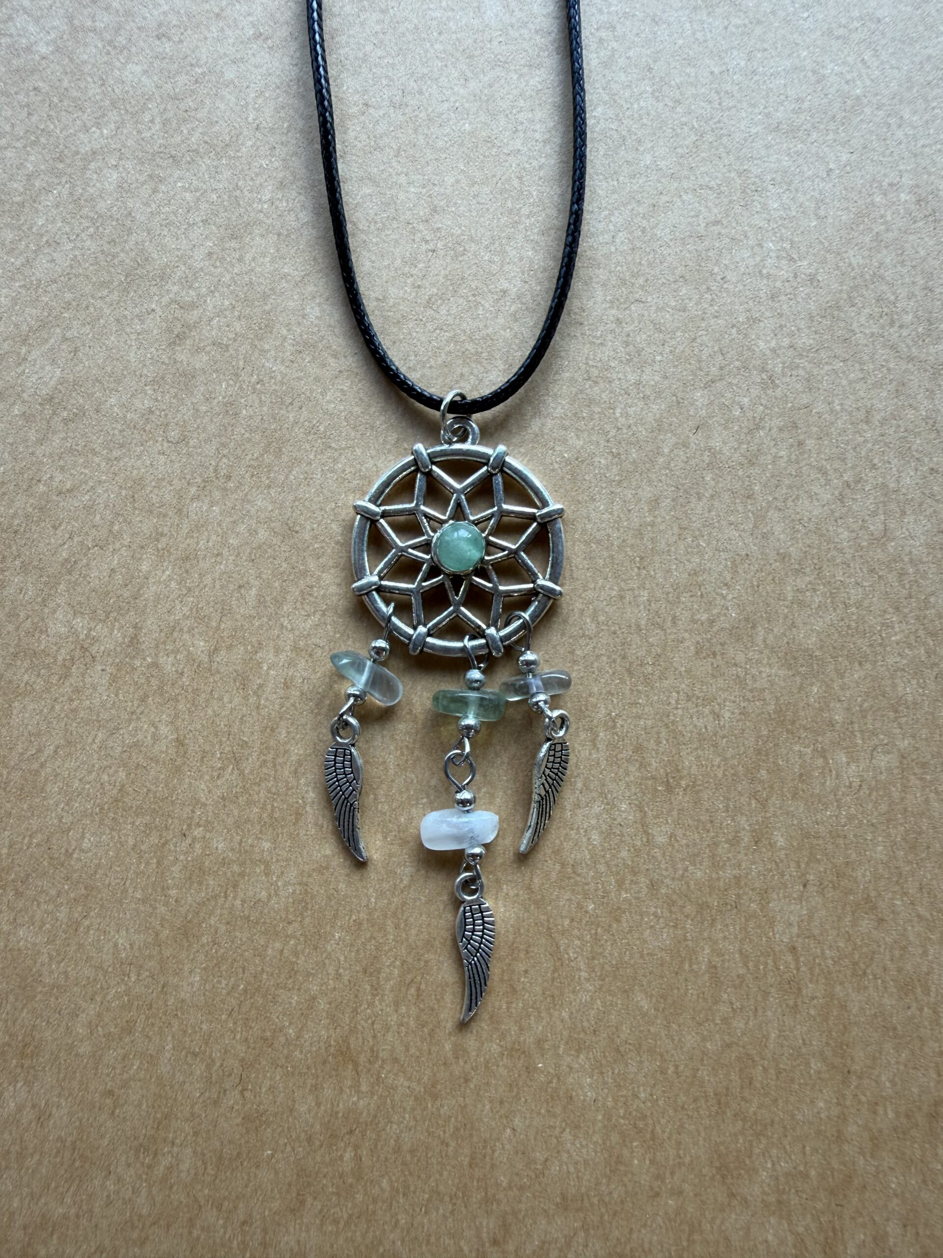 Laissez-vous séduire par les vertus de la pierre avec ce joli collier en forme d’attrape-rêves.